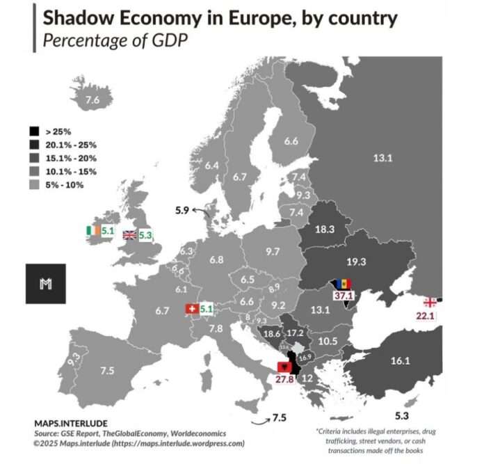 Республика Молдова занимает первое место в Европе по доле теневой экономики по отношению к ВВП — 37,1%, согласно данным за 2025 год, опубликованным порталом bani.md со ссылкой на Mapsinterlude.